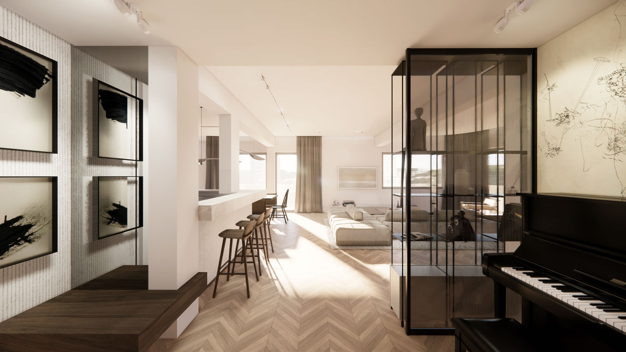 This apartment renovation embraces a calm palette of white tones and natural wood, creating a serene backdrop that highlights its artistic heritage.